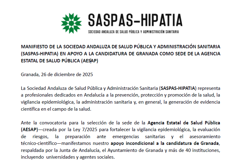 Ante la convocatoria para la selección de la sede de la Agencia Estatal de Salud Pública (AESAP)—creada por la Ley 7/2025 para fortalecer la vigilancia epidemiológica, la evaluación de riesgos, la preparación ante emergencias sanitarias y el asesoramiento técnico-científico—manifestamos nuestro apoyo incondicional a la candidatura de Granada, respaldada por la Junta de Andalucía, el Ayuntamiento de Granada y más de 40 instituciones, incluyendo universidades y agentes sociales.